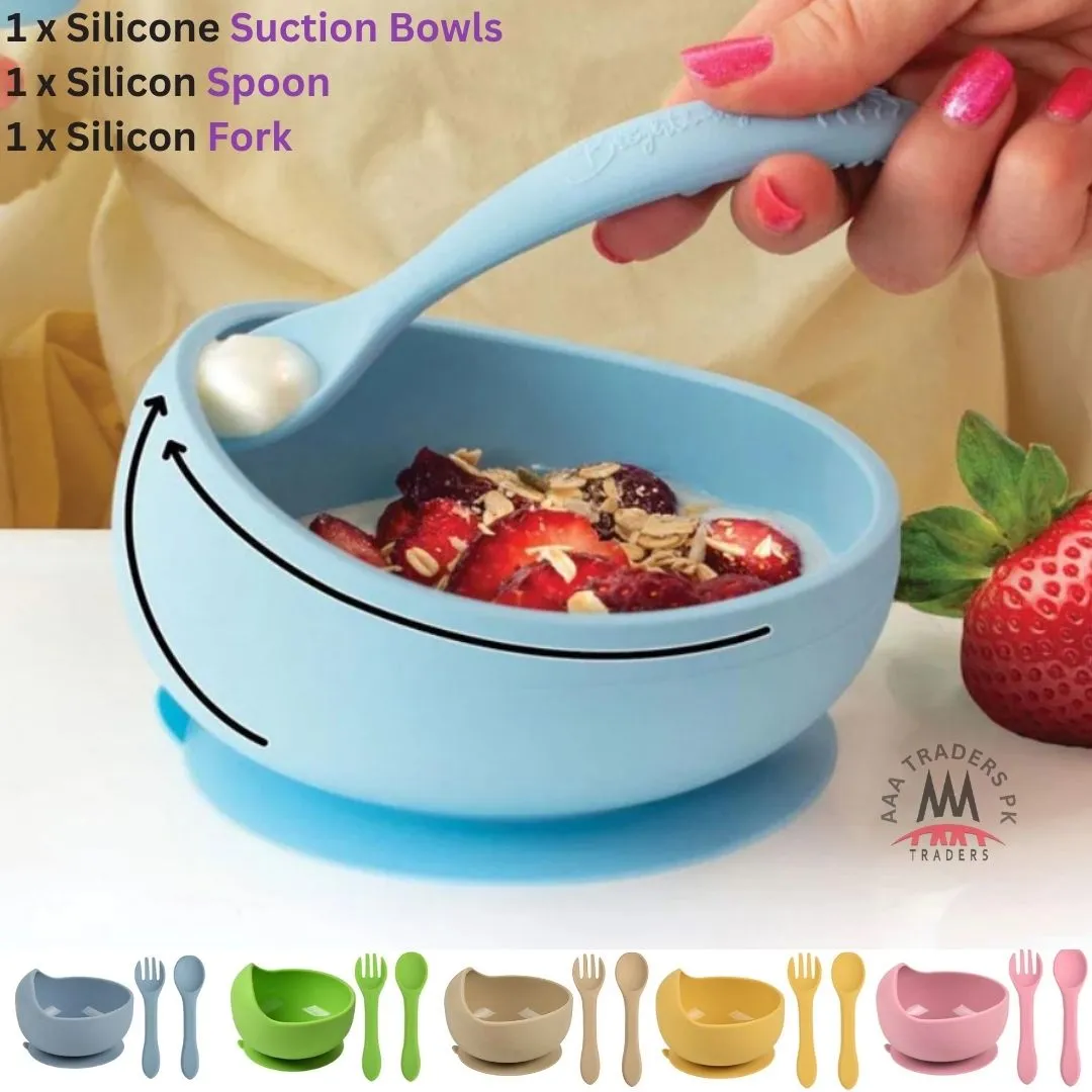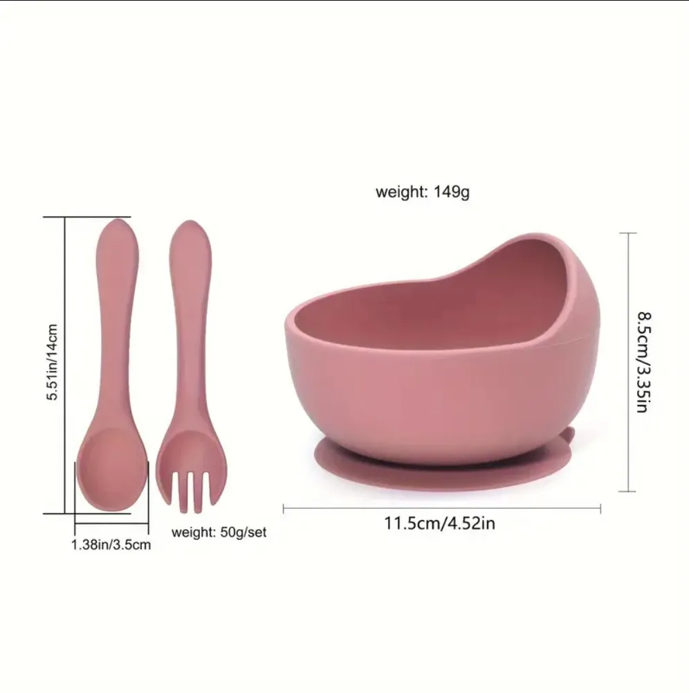 Product Description:"Introduce your little one to independent eating with our 3-piece silicone suction bowl set, wooden spoon, and fork! Made from BPA-free, food-grade silicone and natural wood, this baby feeding essential is designed for safety and durability.Key Features:- 1 x Silicone Suction Bowls - 1 x Silicon Spoon- 1 x Silicon Fork- BPA-free, food-grade silicone- Suction base for stability- Easy to clean and dishwasher safe- Suitable for babies and toddlers (6-36 months)Product Specifications:- Material: Silicone- Color: [Insert colors]- Size: [Insert sizes]- Weight: [Insert weight]- Package Includes: 1 bowls, 1 spoon, 1 fork Product Benefits:- Promotes self-feeding and independence- Soft, flexible silicone for gentle on baby's mouth and hands- Suction base prevents spills and messes- Easy cleaning and storageWhy Buy From Us:- High-quality, safe materials- Affordable price- Fast shipping
